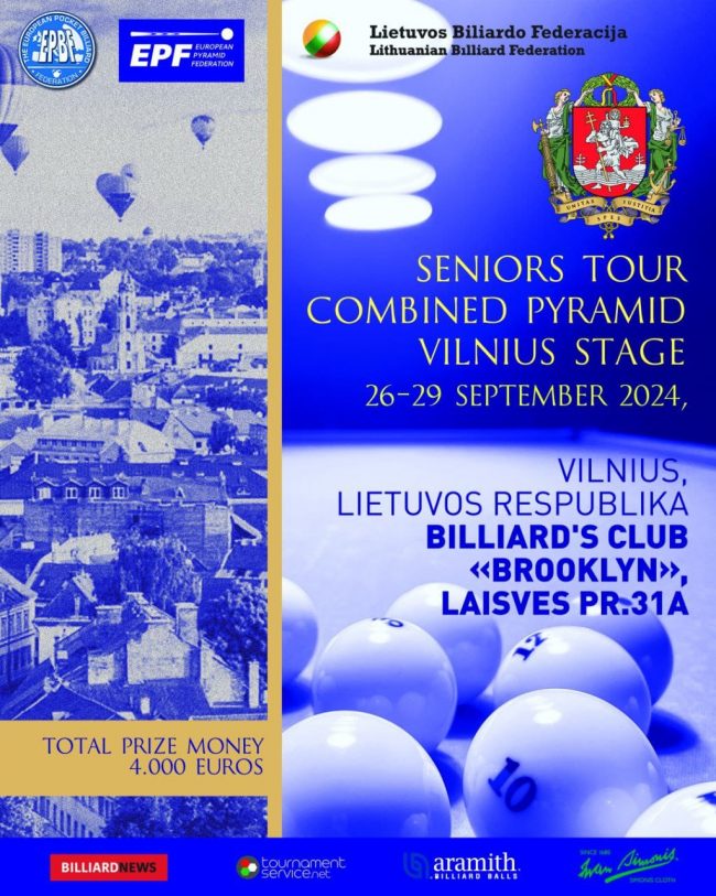 On behalf of European Pyramid Federation Presented by: Luthuanian Billiard Federation Dear Players, dear friends, On behalf of the European Pyramid Federation Board we are delighted to invite you to take part in the SENIORS TOUR 2024 COMBINED PYRAMID LITHUANIA STAGE that will be held at the BK “BROOKLIN”, Vilnius, Lithuania 25-30 September 2024. We…